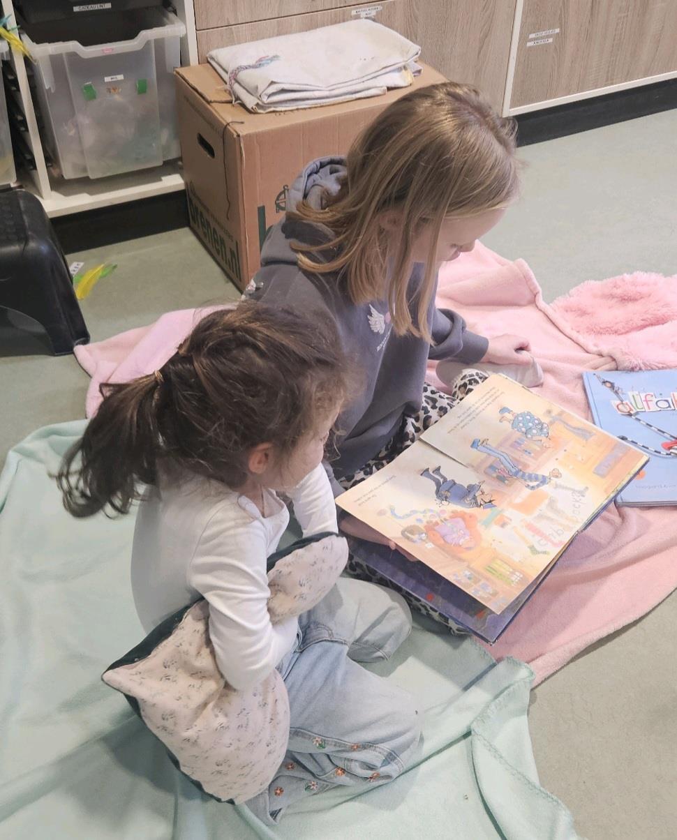 Ook kwamen er ouders en oma’s voorlezen in de klas, wat extra bijzonder was. Daarnaast lazen we elkaar voor en ontdekten we dat je helemaal geen letters nodig hebt om een verhaal te vertellen, plaatjes zijn genoeg! Met de hele school deden we mee aan het ‘kleedjes lezen’: met ons eigen kleedje werden we op verschillende plekken in de school voorgelezen door leerlingen uit de bovenbouw.