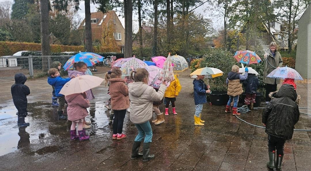Als afsluiting vierden we een vrolijk waterfeest. Iedereen had een regenjas, laarzen en een paraplu mee. Met de tuinslang maakten we regen en stampten we in de plassen. We hadden een waterbaan met bootjes, balonnen met water en flessenvoetbal.
