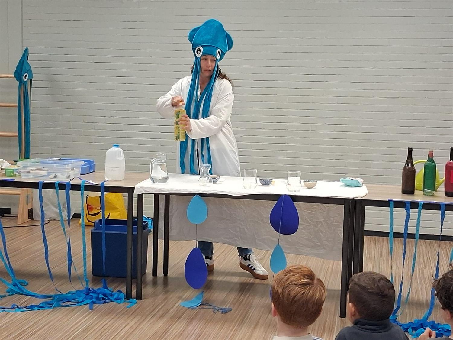 We begonnen met een feestelijke opening door vier professoren, die de kinderen meenamen in een wereld vol verwondering. Ze deden proefjes met ijs, bruisend water, stoom en lieten zelfs horen hoe je muziek kunt maken met water.